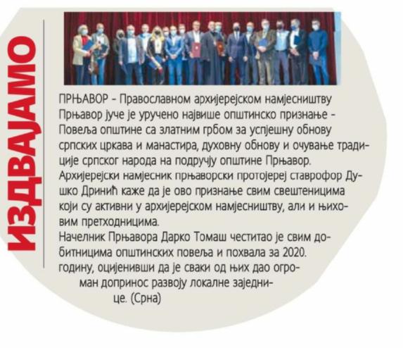 Повеља општине Прњавор са златним грбом општине, додијељена је православном Архијерејском намјесништву Прњавор, за успјешну обнову српских цркава и манастира на подручју ове општине, те духовну обнову и очување традиције српског народа. Архијерејски намјесник и први парох прњаворски протојереј-ставрофор Душко Дринић упућујући захвалност за добијену Плакету, истакао је, да она припада свим свештеницима поменутог намјесништва. „Наше намјесништво у посљедњих 30 година, удуплало се у cмислу броја храмова, парохијских домова, свих потребних помоћних црквених објеката, али и броја свештеника. Хвала свима који су препознали наш рад и додијелили нам признање које нас обавезује да своју свештеничку службу обављамо одговорно, професионално и онако како су то чинили наши преци“, рекао је протојереј Дринић.