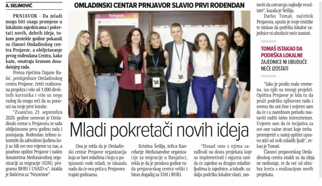 Данас је у сали Центра за културу обиљежена годишњица постојања Омладинског центра Прњавор. Омладински центар годину дана успјешо реализује пројекте на подручју општине Прњавор, а иза себе има четири велика пројекта на којима је учествовало и преко хиљаду директних корисника.