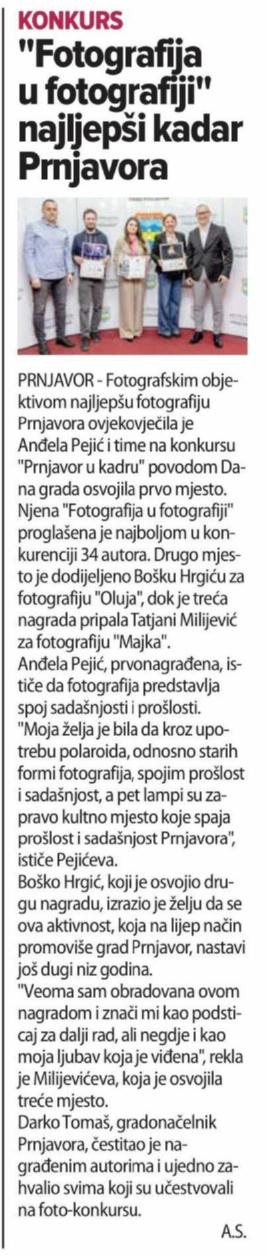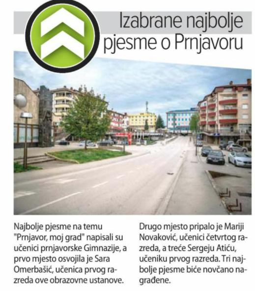Na konkursu za najbolji likovni rad na temu „Prnjavor, moj grad“, Mirjana Kljajić, učenica osmog razreda Osnovne škole „Nikola Tesla“ Prnjavor osvojila je prvo mjesto. Drugo mjesto osvojila je Nikol Kuzmanović, učenica petog razreda Osnovne škole „Ivo Andrić“ Kulaši, dok je Viktoria Andreata, učenica sedmog razreda Osnovne škole „Petar Kočić“ Šibovska osvojila treće mjesto.
